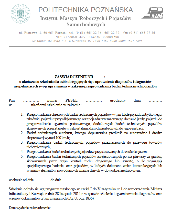 Po odbyciu szkolenia każdy uczestnik otrzymuje imienne zaświadczenie o jego ukończeniu, przygotowane zgodnie ze wzorem zawartym Rozporządzeniu Ministra Infrastruktury i Rozwoju z dnia 28 listopada 2014 r. w sprawie szkolenia i egzaminowania diagnostów oraz wzorów dokumentów z tym związanych (Dz. U. z 2014 r., poz. 1836).